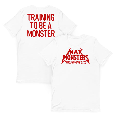 The front proudly bears the Max Monsters Strongman 2026 logo, while the back drives the message home: “Training to be a monster.”